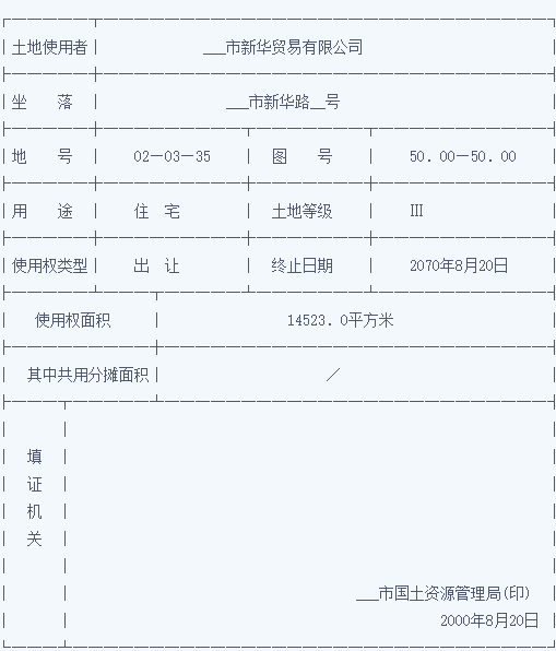 国有土地使用证样本标准化、格式化、标准化,填写在证书说明书中,按栏目标题填写。以下四张图片可以解释样本和填写方法。